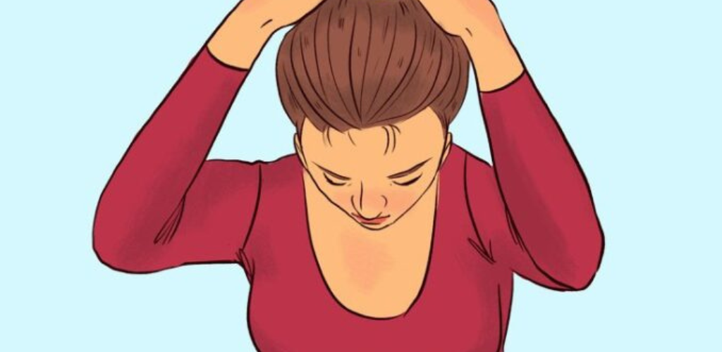 1. Станьте рівно і випряміть спину, голову тримайте рівно. Руки, зчеплені в замок, закладіть на верхівку, голову трохи нахиліть вперед, а потім, чинячи опір руками, намагайтеся повернути голову в початкове положення, дорахуйте до 30 і розслабтеся, повторіть ще раз.