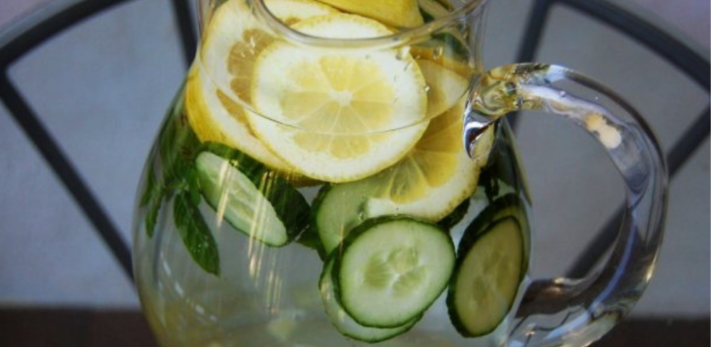 Для приготування цієї води, нам необхідна чиста вода, лимон, огірок, ложка подрібненої свіжого імбиру, м’ята.